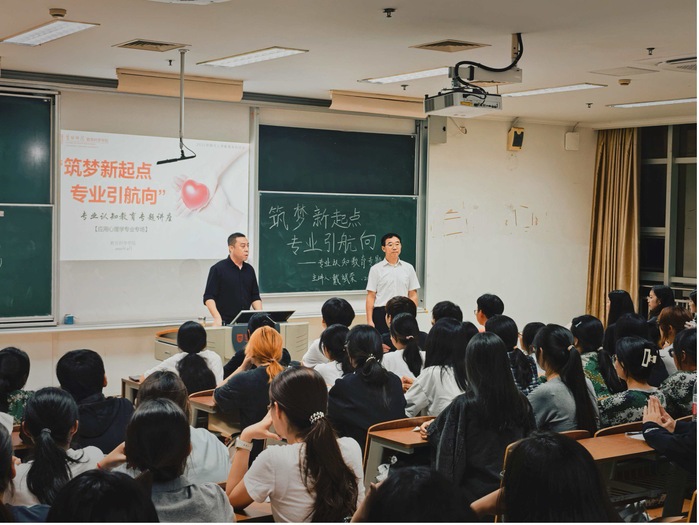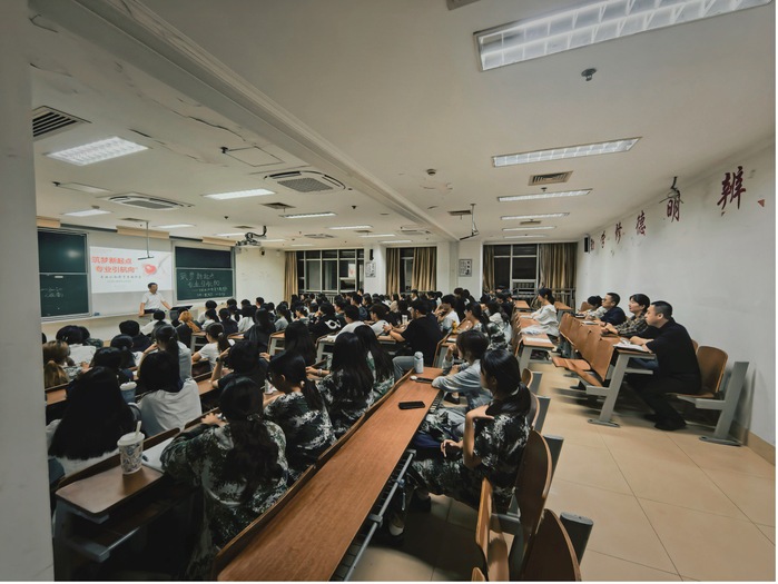 在应用心理学专场讲座中,戴斌荣教授结合心理学学科前沿动态与行业发展趋势,从专业定位、公司平台、公司资源三个维度,系统阐释公司办学优势与专业发展脉络。在学业规划指导环节,他以“飞机升空”为生动喻体,寄语新生“唯有持续夯实知识储备、锤炼专业技能,方能积蓄足够动力飞向学业与职业的高远未来”,并将专业知识体系清晰拆解为“理论奠基、方法支撑、应用实践”三大模块,为新生构建起系统化的学习框架。互动交流阶段,戴教授针对新生普遍关切的就业方向、学习方法、技能提升路径等问题耐心解答,现场互动频繁、氛围热烈融洽。