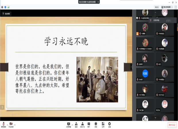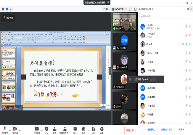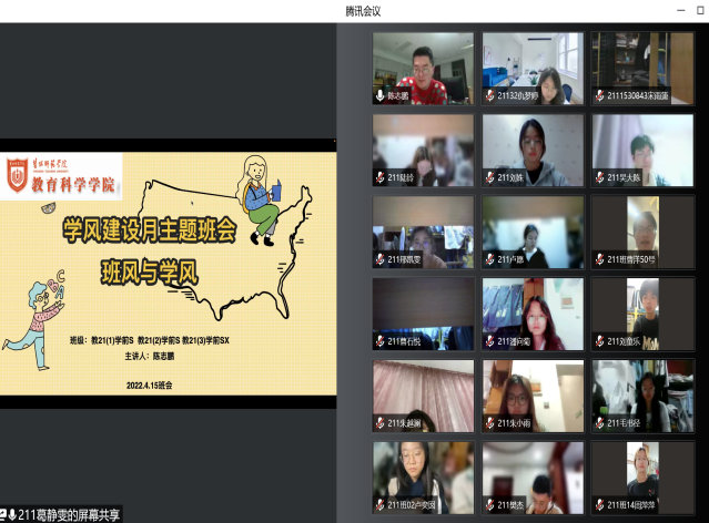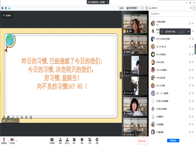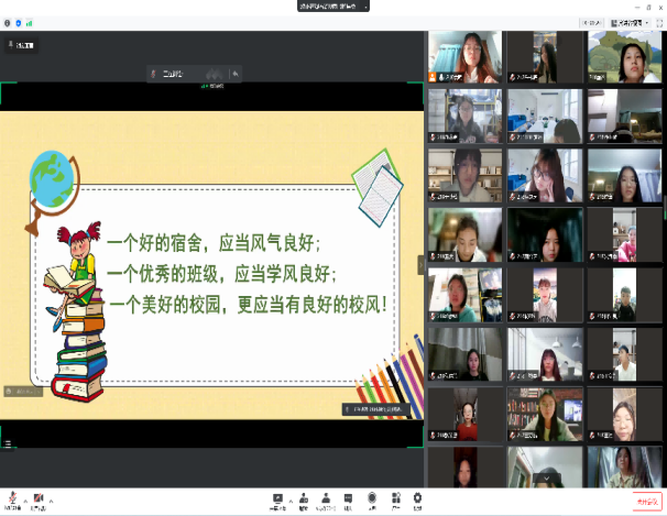 第二次主题班会主要内容为创建优良学风、树立自律意识、养成自律好习惯三个部分。首先向同学们介绍大学学风建设的重要性,引导员工认识到树立学风观念,鼓励同学们立足专业学习,培养自身的专业素养,在学风建设活动中养成科学严谨的治学态度,塑造完整的自我人格。其次,结合目前的网课学习情况反思自己学习状态、生活,是否足够自律,从身边出发寻找身边靓丽的学习风景线,抵制学习“怪象”。最后,指出需要从想明白、从小事做起,日积月累建立信心、坚持,适当奖励自己这三步走来养成自律习惯,引导员工要立足实际,在当下战“疫”期间利用充沛的课余时间制定学习计划,培养自律良好习惯,扎实过好每一天。