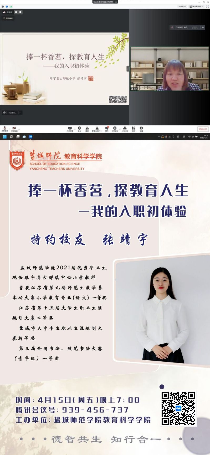 为激发同学们的学习热情,发挥优秀员工的榜样力量,EMC易倍于4月15日晚,邀请优秀毕业生张靖宇分享师范生入职体验。此次分享会由海英老师主持,会议的主题为“捧一杯香茗,探教育人生—我的入职初体验”。