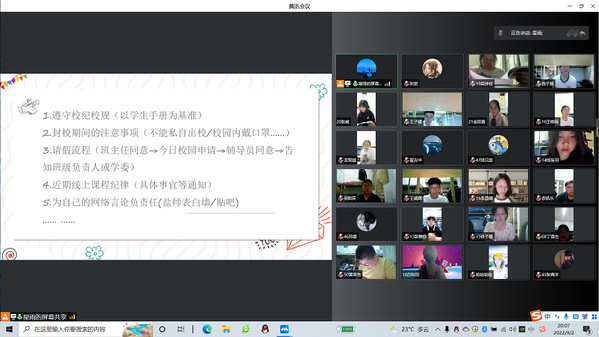 然后,在班助的组织下开展一系列活动,主要为同学们互相认识,讲解常规纪律、线上教学准备及方法指导、班委、舍长选举。活动中,大家积极交流,互相探讨,以积极的心态面对未来,珍惜大学四年时光,实现自己的梦想。