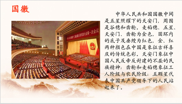 小教226班的班长带着同学们详细学习了国旗、国徽和国歌。国旗:旗上的五颗五角星及其相互关系象征共产党领导下的革命人民大团结。国徽:天安门象征中国人民反帝反封建的不屈的民族精神;齿轮和麦稻穗象征工人阶级与农民阶级;五颗星代表中国共产党领导下的人民站起来了。国歌:中国国歌《义勇军进行曲》,诞生于1931年“9.18”事变之后,它表现了中国人民反抗日本侵略的必胜信心。