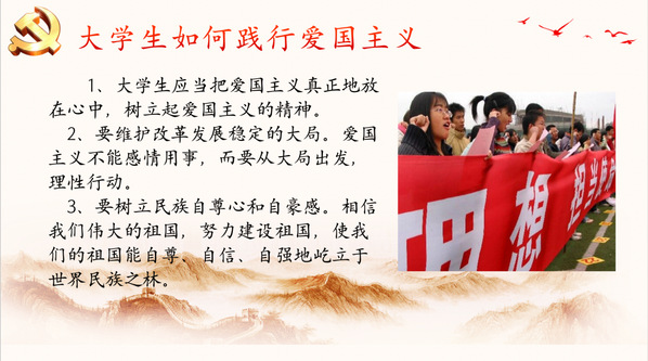 爱国主义是中华民族之魂,是每位中国人民对国家最纯洁、最诚挚、最崇高的情感。学前223班的班长向同学们生动地讲解了“爱国主义”这一词的含义:“爱国主义是指个人或集体对祖国的一种积极和支持的态度,揭示了个人对祖国的依存关系,是人们对自己家园以及民族和文化的归属感、认同感、尊严感与荣誉感的统一。集中表现为民族自尊心和民族自信心,为保卫祖国和争取祖国的独立富强而献身的奋斗精神。”同学们听后纷纷点头表示赞同,并逐一表达了自己对爱国主义的理解。爱国主义不仅体现在政治、法律、道德、艺术、宗教等各种意识形态和整个上层建筑之中,而且渗透到社会生活各个方面,成为影响民族和国家命运的重要因素。