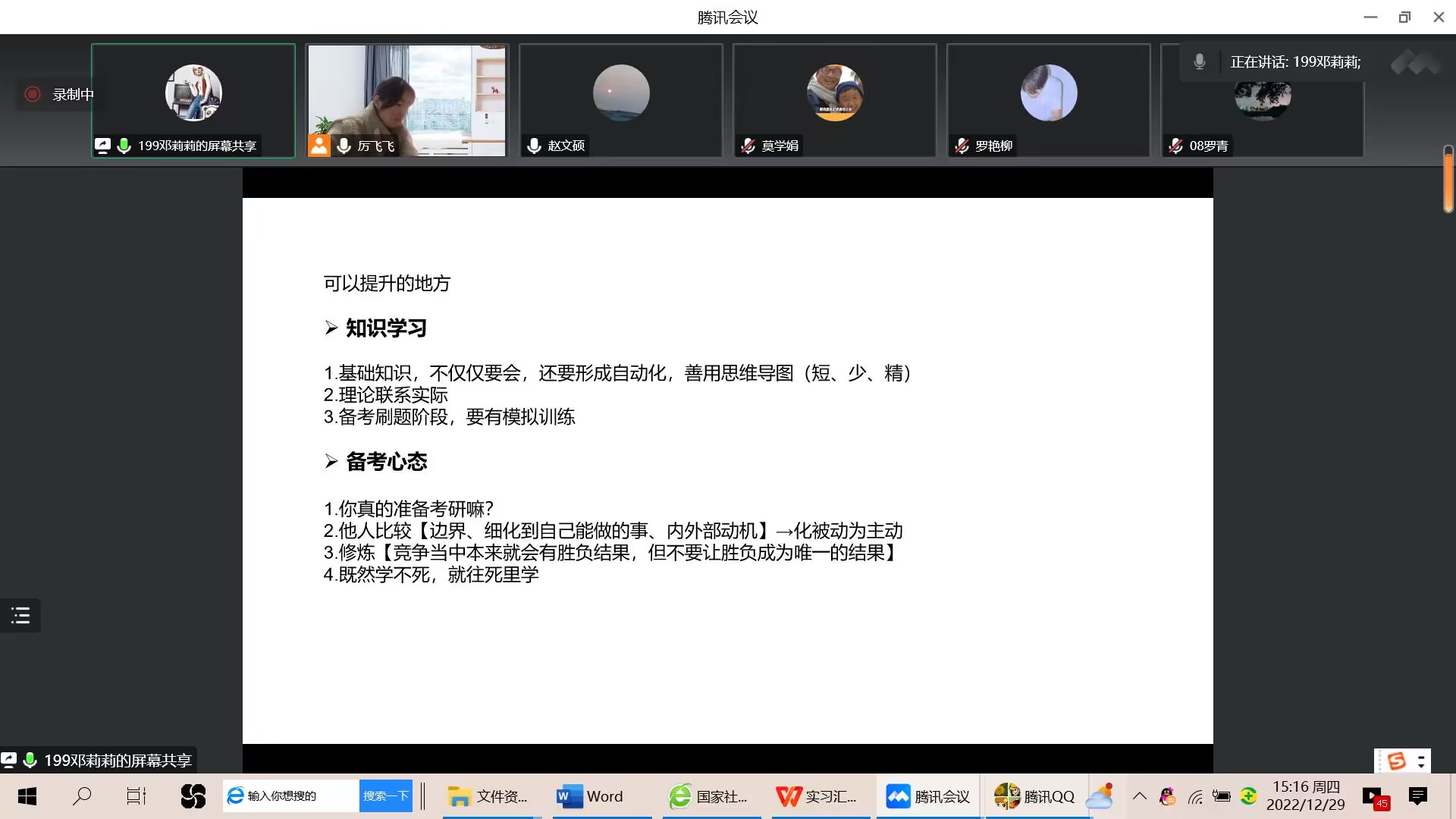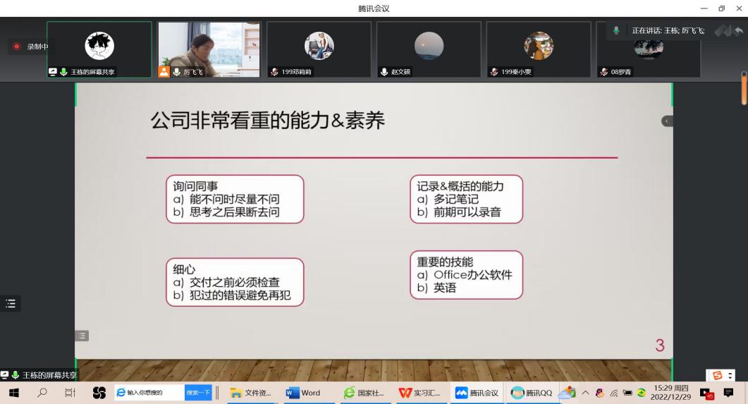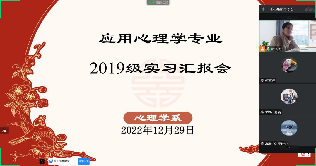 2022年12月29日下午,心理学系在腾讯会议举行应用心理学专业2019级毕业生实习成果汇报会,厉飞飞主持本次活动,心理学系全体员工参与本次汇报会。实习汇报既是对员工实习成效的检验,也是提升应用心理学专业员工专业技能的重要环节。