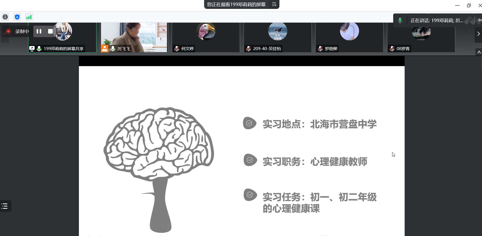 2019级应用心理学专业集中实习主要在盐城生物工程高等职业技术公司、盐城壹家族企业管理咨询有限公司、盐城监狱等地进行,实习内容包括心理咨询、心理健康教育课程教学、参与员工团建、幕后公众号推文发送等。各实习点分别由1位同学负责汇报,其他成员补充,员工从实习概况、实习过程、实习体会几个方面进行了汇报,充分展示了员工从理论走向实践、厚积而薄发的风采。