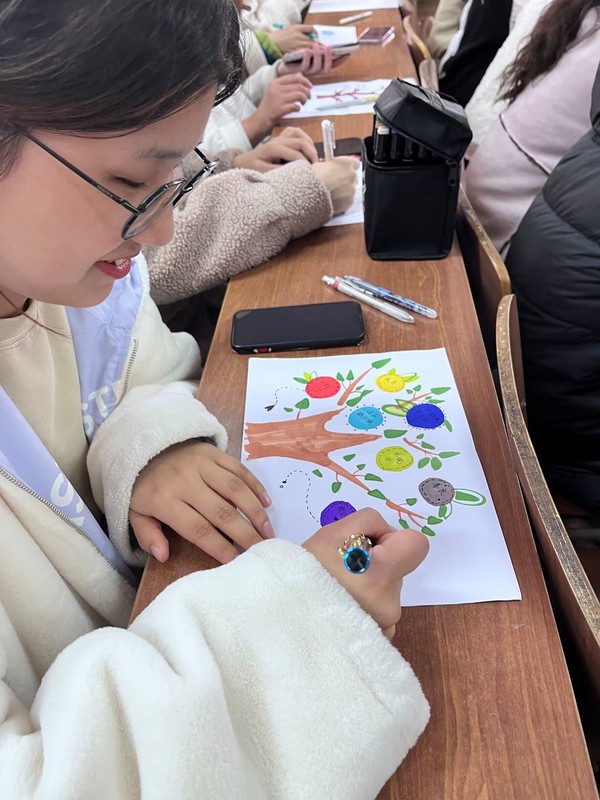 紧接着,在主持人介绍完绘画要求之后,大家开始设计起自己的优点树。同学们用缤纷的彩笔绘制出属于自己的树,并在枝桠上写上自己的优点,描上可爱的树叶边框,于空白处写下自己的优点成就的光辉事迹。天马行空的绘画再加上深思熟虑后填写的内容,不仅展现出大家不凡的设计才能,还激发了同学们的自豪感和自信心。每一位认真绘画的同学脸上都流露出骄傲与自豪,每一个微笑都洋溢着青春与朝气。现场的氛围令人心驰神往,绘制的作品让人赞不绝口。