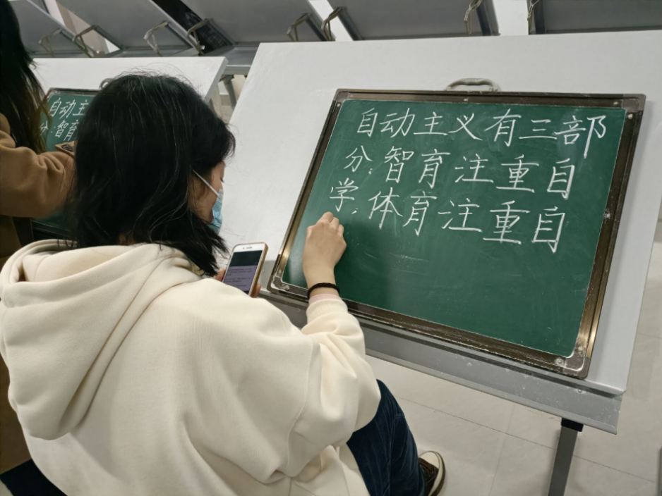 本次粉笔字书写交流活动精选三句陶行知语录,同学们任选其一进行书写交流。第一句:教师必须具有健康的体魄,农人的身手,科学的头脑,艺术的兴味,改革社会的精神。这句话告诉我们如果想要成为教师必须要有的修养。第二句:自动主义有三部分:智育注重自学;体育注重自强;德育注重自治。从这句话里我们品味出了陶行知先生注重的三种“育”,即智育、体育和德育背后的内涵和要求。第三句:有行动才能得到知识,有知识才能创造,有创造才有热烈的兴趣。这句话解释了行动、知识、创造和兴趣之间的关联,对我们的学习有重要的指导意义。