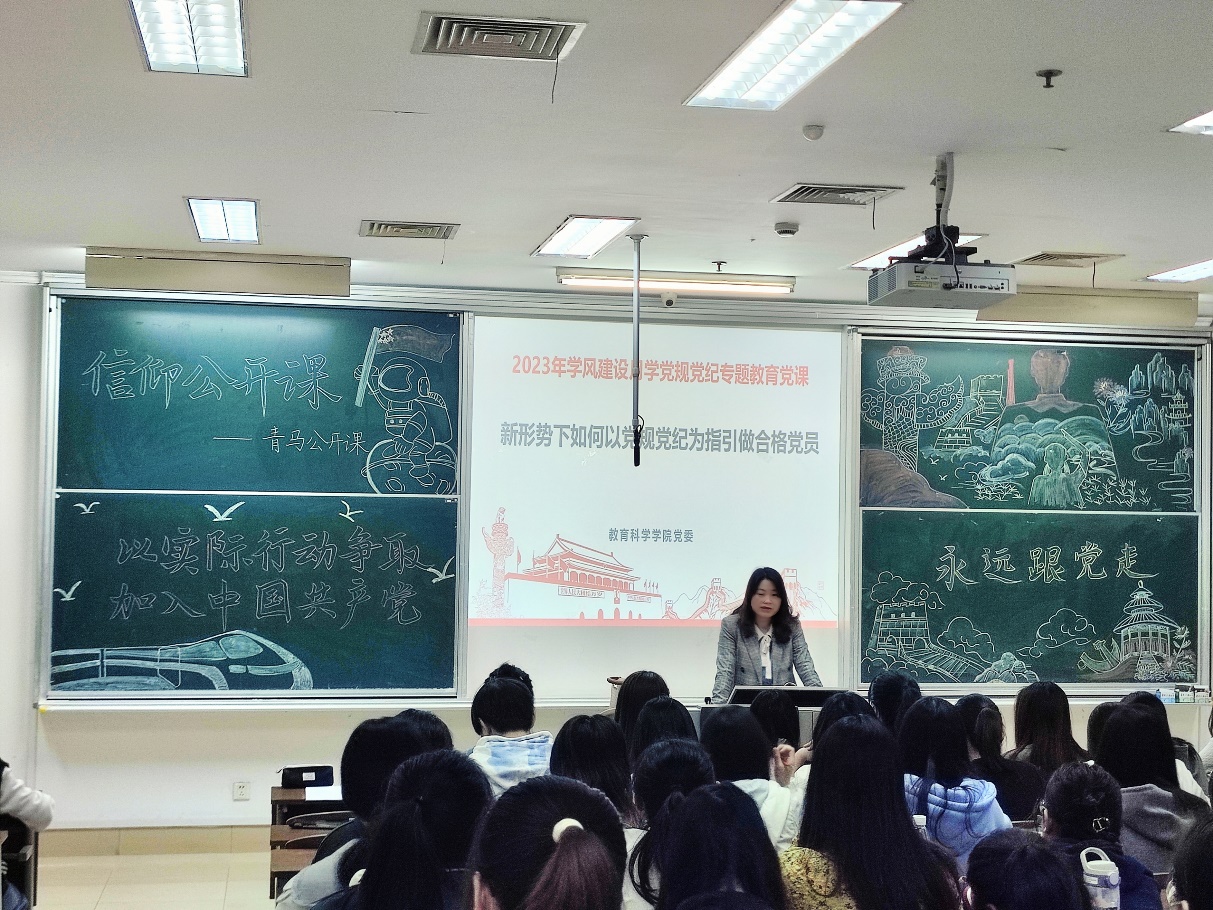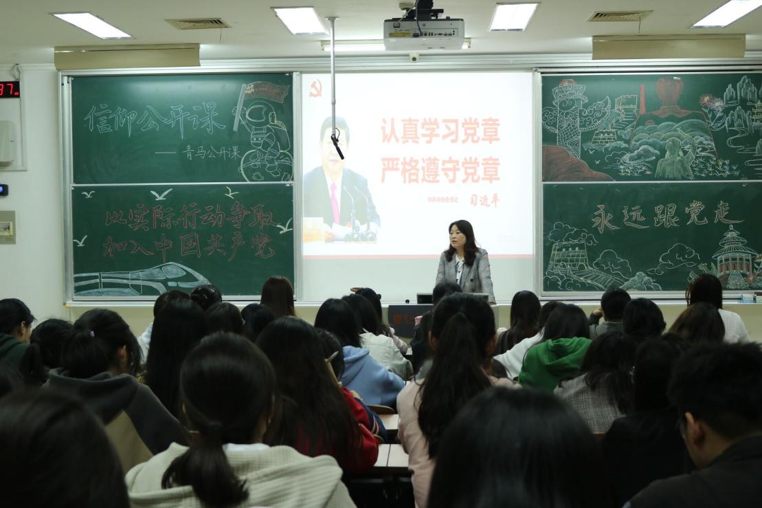 杨日晨从党章重点知识、党的纪律学习、习近平新时代中国特色社会主义思想学习解读四个方面出发,深入浅出地引导同学们认识遵守党规党纪的重要性。她强调,要认真学习党章,严格遵守党章,守纪律,讲规矩,只有严党纪才能保证讲党性、守党规。她指出,“合格”是一个无止境的过程,每一位同志都要把做合格党员作为毕生追求,呼吁广大青年学子肯奉献、敢作为,努力学习发展,不断成长进步。
