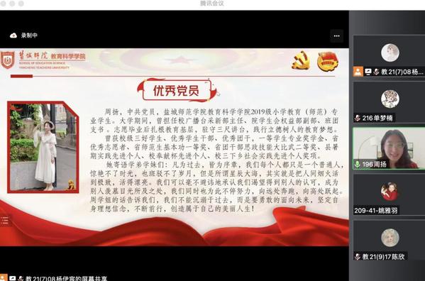 接着,房琦学姐为大家讲述她的两段特别经历。在党旗前宣誓时,她领悟到成为一名中国共产党员,不是努力的终点,而是一个新的开始。从受党关怀长大的懵懂少年到思想成熟的新时代青年,这是一段漫长的道路,更是一条学习的道路,也是一条成长的道路。必须夯实自身修养,更好的为人民服务。在备战江苏省教师基本功大赛期间,她感受到来自老师、舍友的关心照顾。她认为,我们要懂得感恩,在党的领导下,发挥我们青年的力量,抓住机遇、迎难而上、有所担当,有所理想。