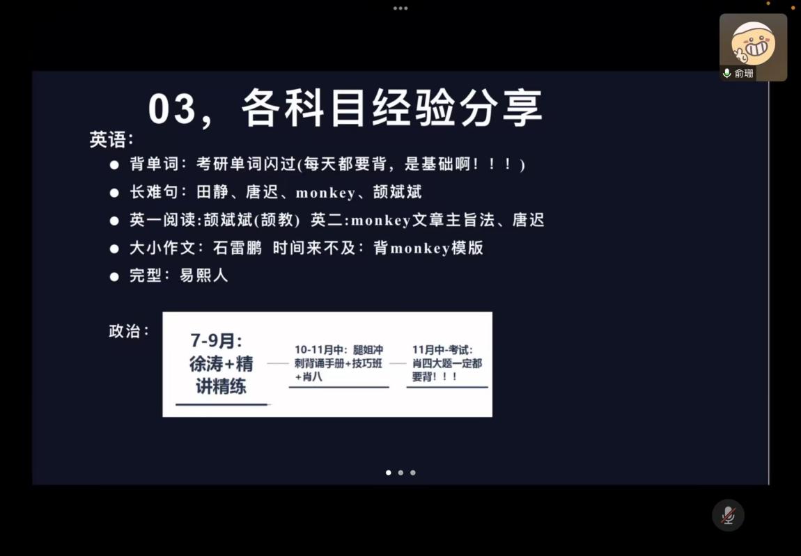 俞珊主要了分享初试备考的经验,以及分数出来后,根据周边了解的整体情况,如何及时快速获得信息调剂成功等;万玉玟同学介绍了自己在初试备考期间做的准备,以及如何择校等方面的内容。