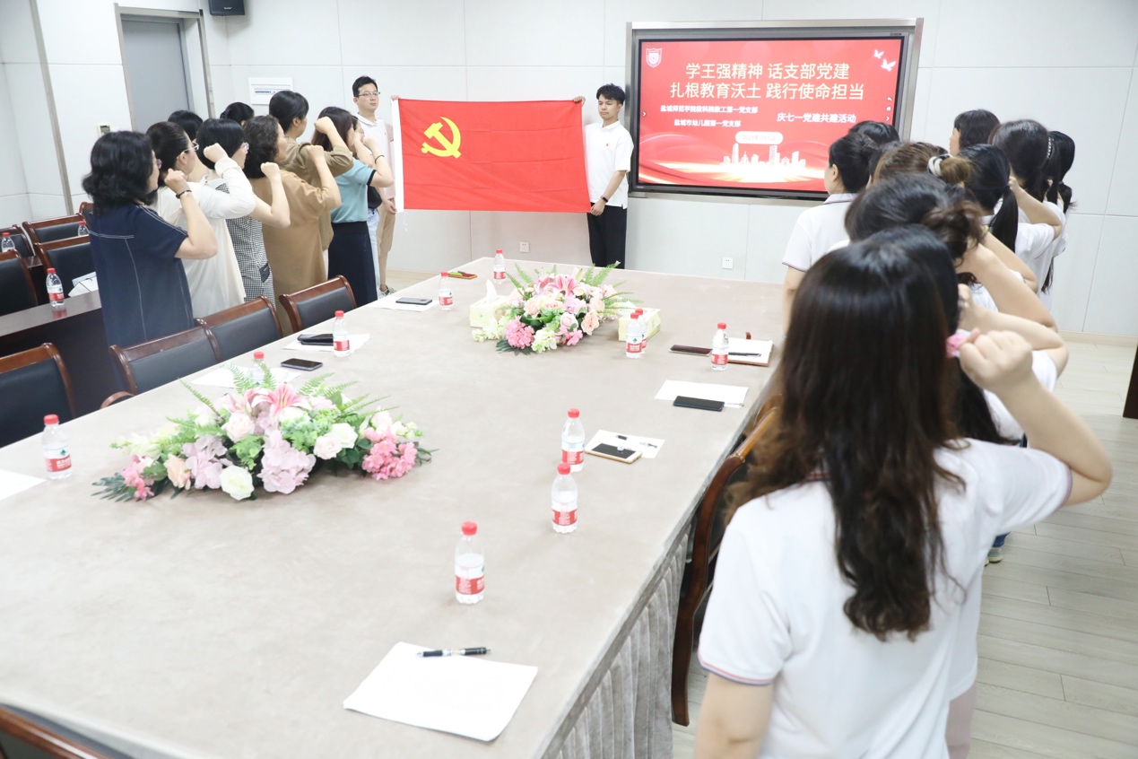 为热烈庆祝中国共产党建党102周年,深入开展学习贯彻习近平新时代中国特色社会主义思想主题教育,进一步加强与市幼儿园的结对共建工作,7月1日上午,EMC易倍教工第一党支部与盐城市幼儿园第一党支部联合举办“学王强精神,话支部党建,扎根教育沃土,践行使命担当”庆“七一”党建共建活动。市幼儿园园长陈莉萍、市幼儿园副园长丁荣秋、市幼儿园第一党支部书记杨柳、公司党委书记杨日晨、市幼儿园第一党支部、EMC易倍教工第一党支部全体党员参加了活动。