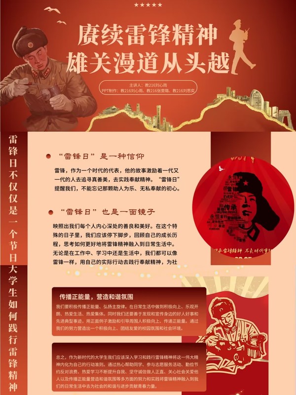 2024年3月5日是第61个“学雷锋纪念日”,雷锋精神是中华民族精神的瑰宝,是社会主义高尚品德的典范。为了激励老员工做中华民族传统美德的传承者、社会主义道德规范的实践者、良好社会风尚的创造者、新时代“六地”目标的奋斗者,进一步践行雷锋精神、传承红色基因、把握时代内涵,公司EMC易倍以“传承雷锋精神,追忆璀璨星光”为主题,开展了学雷锋PPT创意大赛,用实际行动激发青年员工的奉献精神,让雷锋精神生生不息永流传。