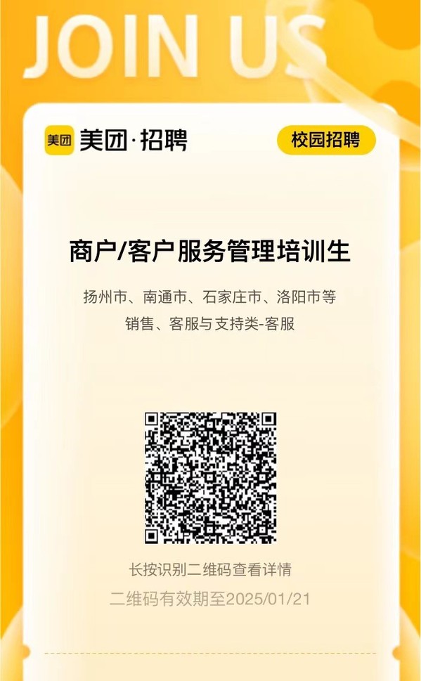 4.通过培养方案打造成最适合美团服务体验部的复合型管理人才,形成文化认同、潜力出众、跨专业复合型的优秀管理后备人才梯队,更有利于个人职业规划和长期发展。