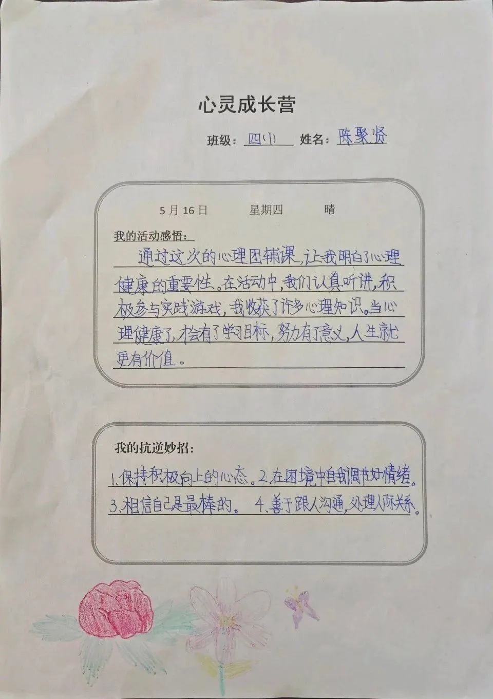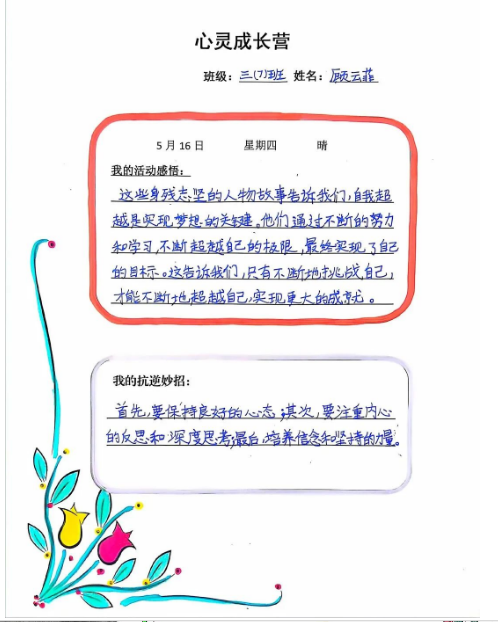 增强抗逆力室内心理健康课。先通过游戏“鸡蛋变凤凰”,让孩子们发现游戏并不是一帆风顺的,有前进也有后退,在成长道路上亦是如此。接着,根据志愿者出示人物受挫经历的提示,猜出他们分别是谁。观看完没有双手、双脚的著名演讲家力克·胡哲的视频后,孩子们在老师引导下,尝试不用手写字、翻书,亲身体会无手生活的困难,在惊叹不可思议后,懂得了在面临逆境和挫折的时候,要积极乐观地应对,直面困难,成长自我。