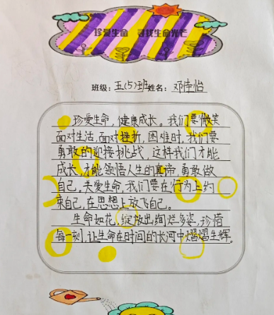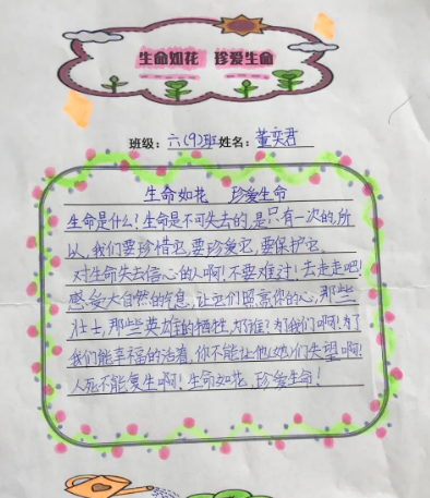 珍爱生命室内心理健康课。活动通过游戏体验,引出生命话题;然后观看视频《从1岁到100岁》,和同学们初谈生命——告诉同学们我们每个人对生命都有美好的期望。当然,在现实中,我们的人生可没有快进键,我们需要踏实地过好每一天才能实现我们的美好期望。最后拓展延伸告诉同学们生命只有一次,要珍爱生命。
