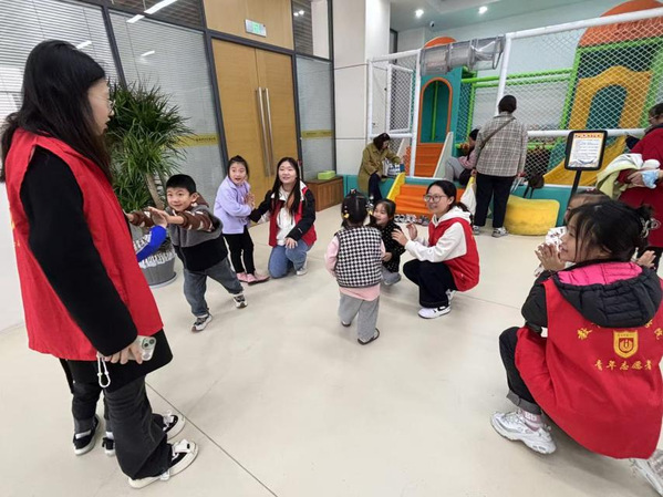 在“志愿游戏,点亮孩子欢乐时光”的主题下,志愿者们巧妙地以“粘泡泡糖”这一趣味游戏作为开场,迅速拉近了与孩子们的距离。起初,孩子们害羞腼腆,但在志愿者们亲切的指引中,他们放下了拘谨,积极参与到活动中来。随后,孩子们参与了“猜书名”、“头顶书”等趣味读书活动,志愿者们以乐教乐,引导孩子们树立正确的世界观、人生观和价值观。