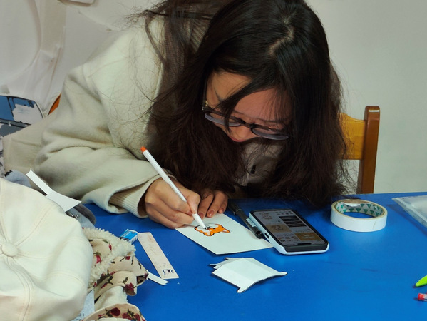 活动伊始,主持人向大家介绍了纸小狗的制作流程——首先画出小狗的头和身体,接着上色,然后进行折叠,最后将小狗的头和身体粘到一起,纸小狗就完成了。听完讲解,手工创作区的同学们十分热情,充分发挥自己的想象力和动手能力,纸张在指尖或灵动跳跃,或精心折叠,或巧妙装饰……一只只独一无二的纸小狗纷纷诞生,琳琅满目的纸小狗作品中,有的萌态可掬,有的创意十足,真是让人“眼前一亮又一亮”。
