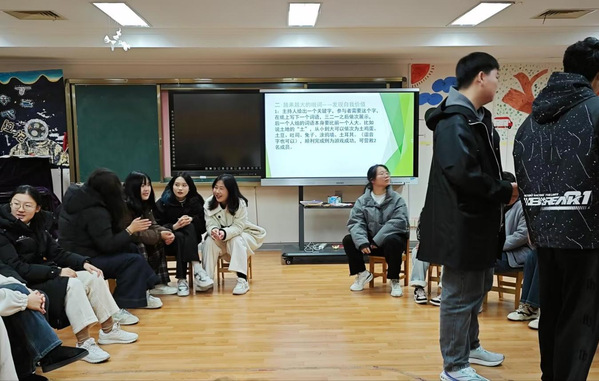 交流会在“越来越大的词组”游戏中迎来了尾声,主持人让大家按顺序说出越来越大的词汇。第一个词语出现后,接词的同学信心满满,随着任务难度增大,有的同学胸有成竹,有的同学抓耳挠腮,神态各异。无论是“芋圆-芋泥-芋泥蛋糕”还是“火鸟-火堆-火山群岛”,在精彩的接词比赛之中,大家的热情渐渐上升,气氛越来越活跃。顺利完成的小组成功解救出自己的成员,无不眉开眼笑。