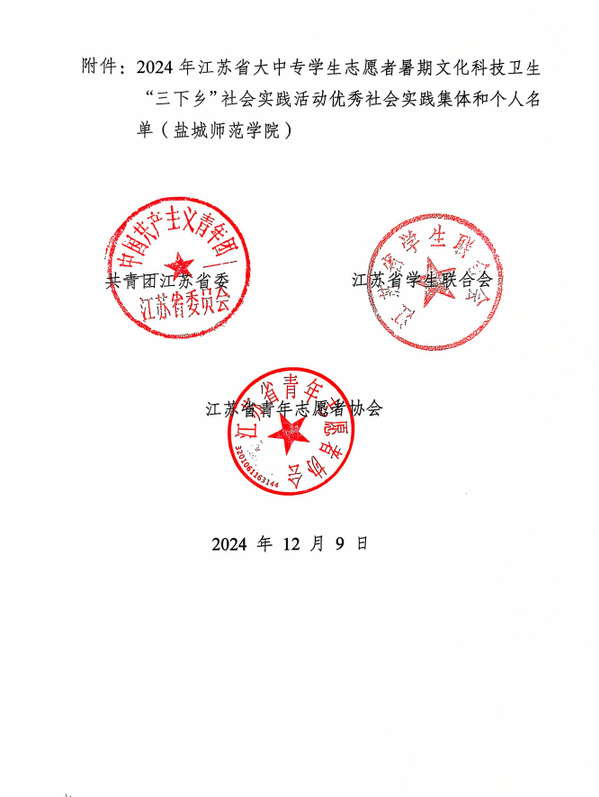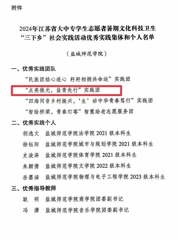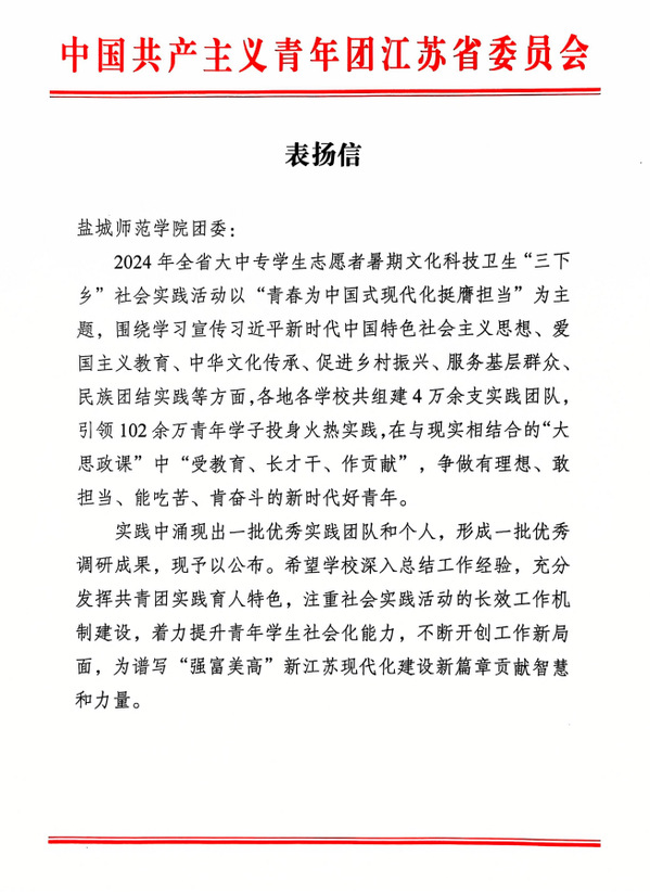 近日,EMC易倍官网团委收到共青团江苏省委、江苏省员工联合会、江苏省青年志愿者协会对2024年全省大中专员工志愿者暑期文化科技卫生“三下乡”社会实践活动的表扬信,公司“点亮微光 盐青先行”(第二季)乡村振兴实践团荣获“优秀实践团队”荣誉。