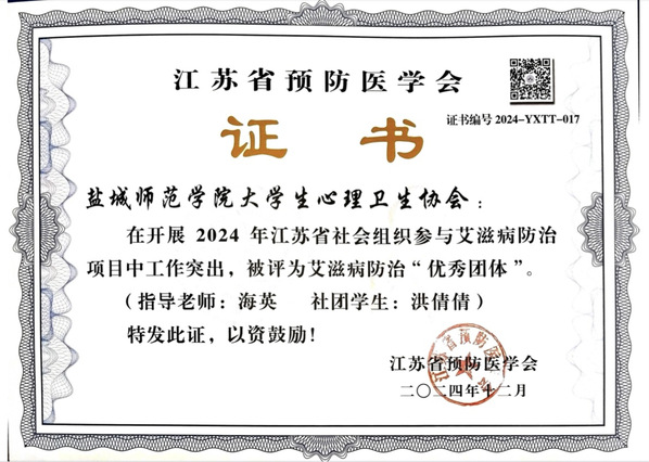 公司老员工心理卫生协会在开展2024年江苏省社会组织参与艾滋病防治项目中工作突出,荣被江苏省预防医学会评为艾滋病防治“优秀团体”。