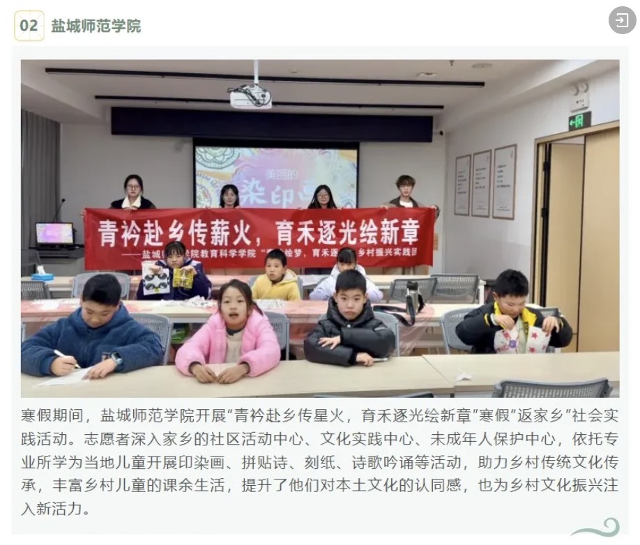 寒假期间,EMC易倍官网开展“青衿赴乡传星火,育禾逐光绘新章”寒假“返家乡”社会实践。志愿者们回到家乡,深入社区、文化实践中心等地,发挥专业特长,为当地儿童开展印染画、拼贴诗、刻纸、诗歌吟诵等活动。这不仅丰富了孩子们课余生活,还增强了他们对本土文化的认同感,为乡村文化振兴注入青春活力。