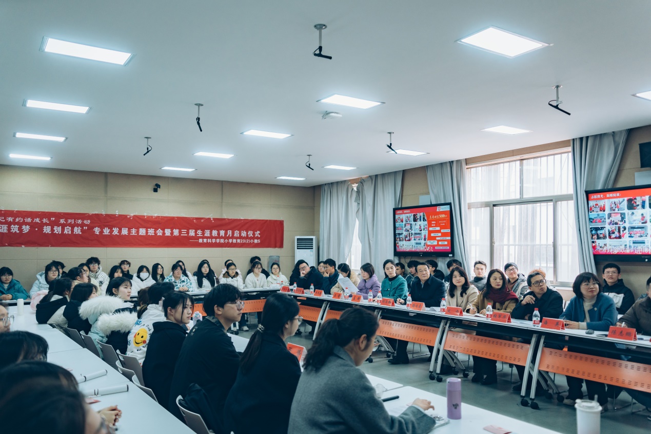 本次主题班会设置了班情汇报展示、生涯规划分享、时光信箱FLAG、校外导师结对等七个环节,内容丰富、形式多样。首先,班长王佳以《我们在盐师写下一首诗》简要汇报了班级在学风建设、实践活动、就业意愿等方面的班级建设情况。随后,员工代表张琳茗、游娅婷分别分享了支教实践和竞赛访学的成长经历,以同辈视角传递青春正能量。2025届毕业生代表张赟与刘清扬结合自身经历,分享了考研心路历程与职业规划经验。活动特别邀请了两位员工现场分享:盐城市亭湖区实验小学副董事长、盐城市名董事长培养对象、2013届员工王珊结合自身从教经历,深入剖析了师范专业多元化发展路径;盐城市第一小学高级教师、江苏省教学名师、2006届员工王蕾则分享了职业发展的真知灼见。两位员工为员工们勾勒了职业发展路径,鼓励大家拓宽视野、提升实践能力,认识教育专业的核心竞争力,为未来奠定基础。