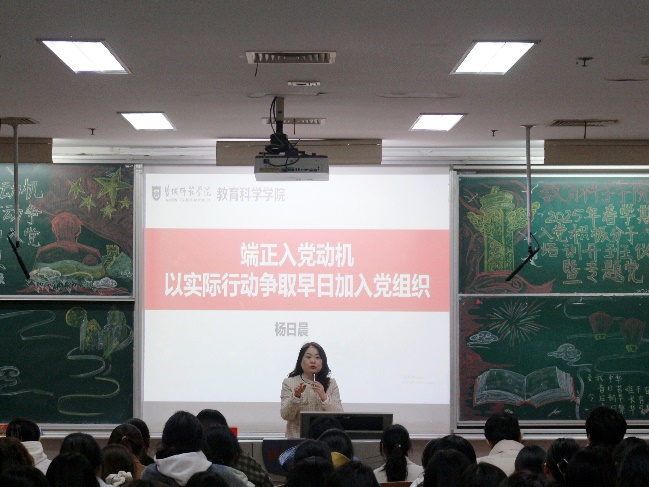开班仪式后,杨日晨以“端正入党动机 以实际行动争取早日加入党组织”为主题开展了第一堂党课,从“什么是正确的入党动机”“为什么要端正入党动机”“按照党员标准严格要求自己”三个方面阐述了端正入党动机的重要性。她指出,全体学员要端正入党动机,坚定理想信念,深学细悟党的理论,自觉用党的创新理论武装头脑、指导学习,在学习和实践中勇担使命、锐意进取,以实际行动争取早日在思想上、组织上入党。