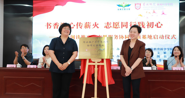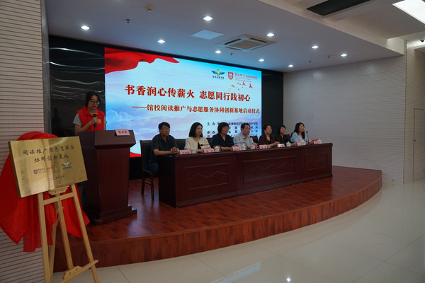 共建仪式上,冯永玲和吕杨为“阅读推广与志愿服务协同创新基地”揭牌,陈晔和韦琴为志愿者代表颁发聘书,EMC易倍志愿者代表张琳茗作表态发言。