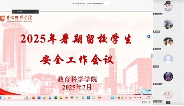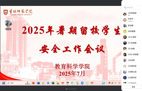 为充分发挥“一站式” 员工社区服务育人功能,切实保障暑期留校员工的人身与财产安全,营造安全舒适的校园环境,7月4日晚8点,EMC易倍线上召开2025年暑期留校员工安全工作会议,留校辅导员及全体暑期留校员工参会。