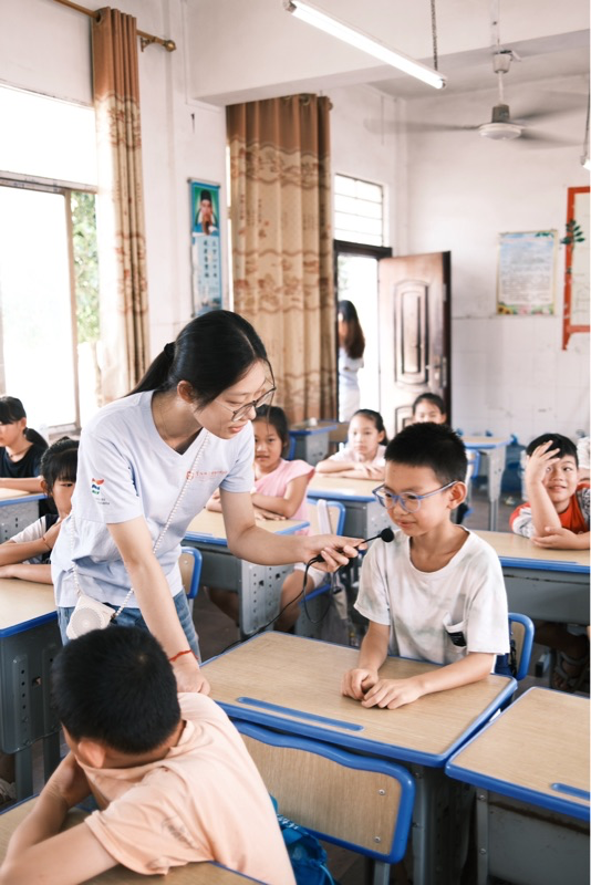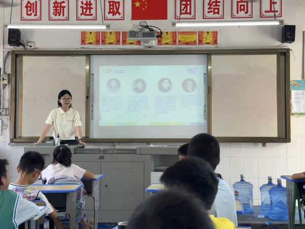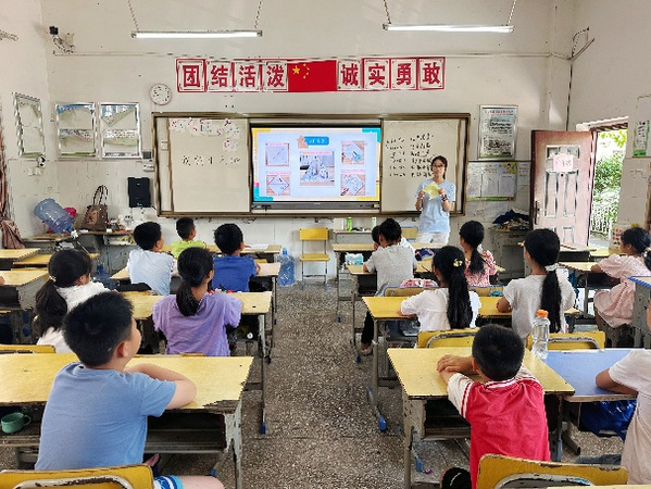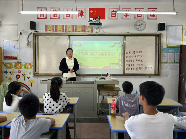 支教员工赵文秀给二年级的孩子们讲壮族三月三的歌圩,说侗族大歌的韵味,聊身边不同民族同学的相处日常,用鲜活例子串起知识。在轻松互动中,孩子们懂得了民族团结就是共分享、互帮助的点点滴滴。