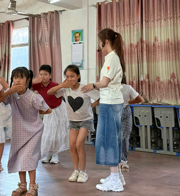 支教员工周恩择和三年级的孩子们尽情舞动彝族的“阿细跳月”,他们跟着节拍挥动手帕、踮脚跳跃,从生疏磕绊到渐入佳境,在舞步中释放活力,在律动里感知纯粹的快乐。
