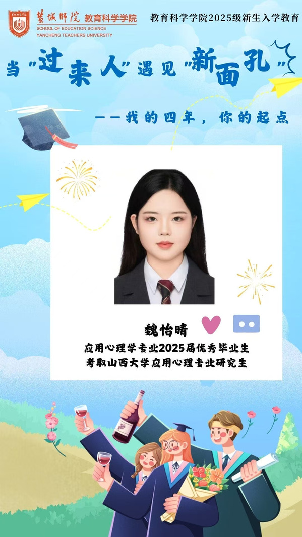 为帮助新生迅速适应老员工活,找寻职业生涯的规划方向,8月29日晚,EMC易倍邀请2025届应用心理学专业2025届优秀毕业生魏怡晴作为“当‘过来人’遇见‘新面孔’:我的四年,你的起点”主题分享会第10期分享者。大学四年,魏怡晴从初入校园时探索方向,到逐步坚定考研目标,凭借对心理学的热忱与不懈的努力,最终成功考取山西大学应用心理专业研究生,在追逐梦想的道路上,走出了属于自己的精彩成长线。